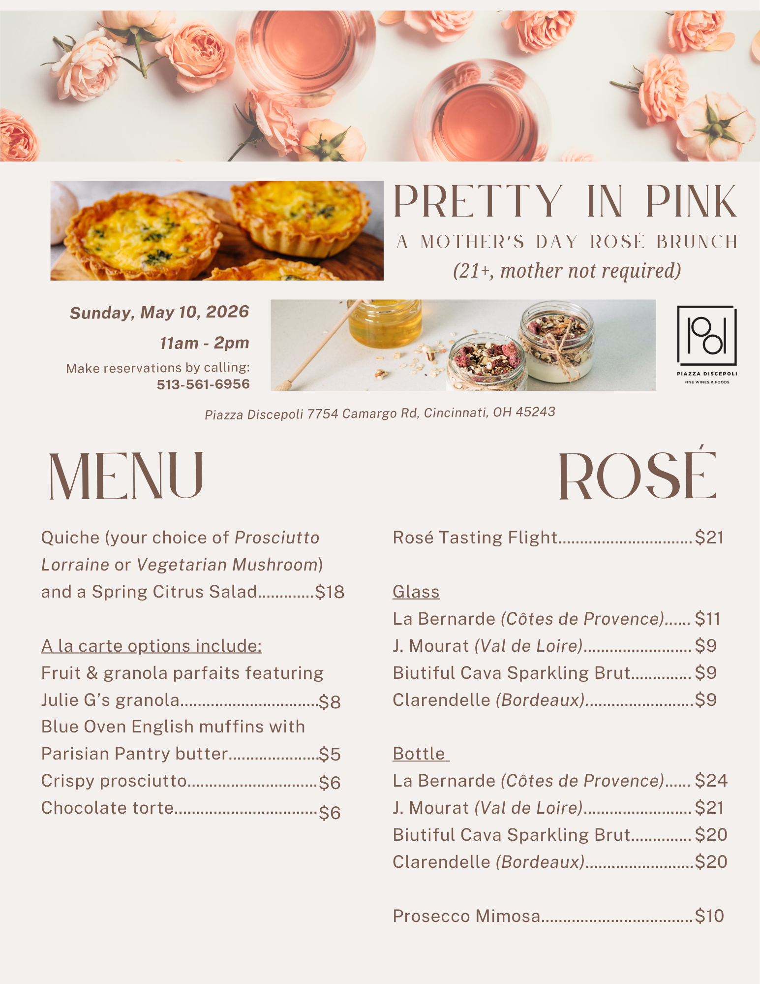 Reserve your table in advance, seating is limited, and this event is expected to sell out. Brunch will be served from 11am-2pm, and we will be taking reservations from 11am-1pm. You can confirm your reservation by calling us at 513-561-6956.