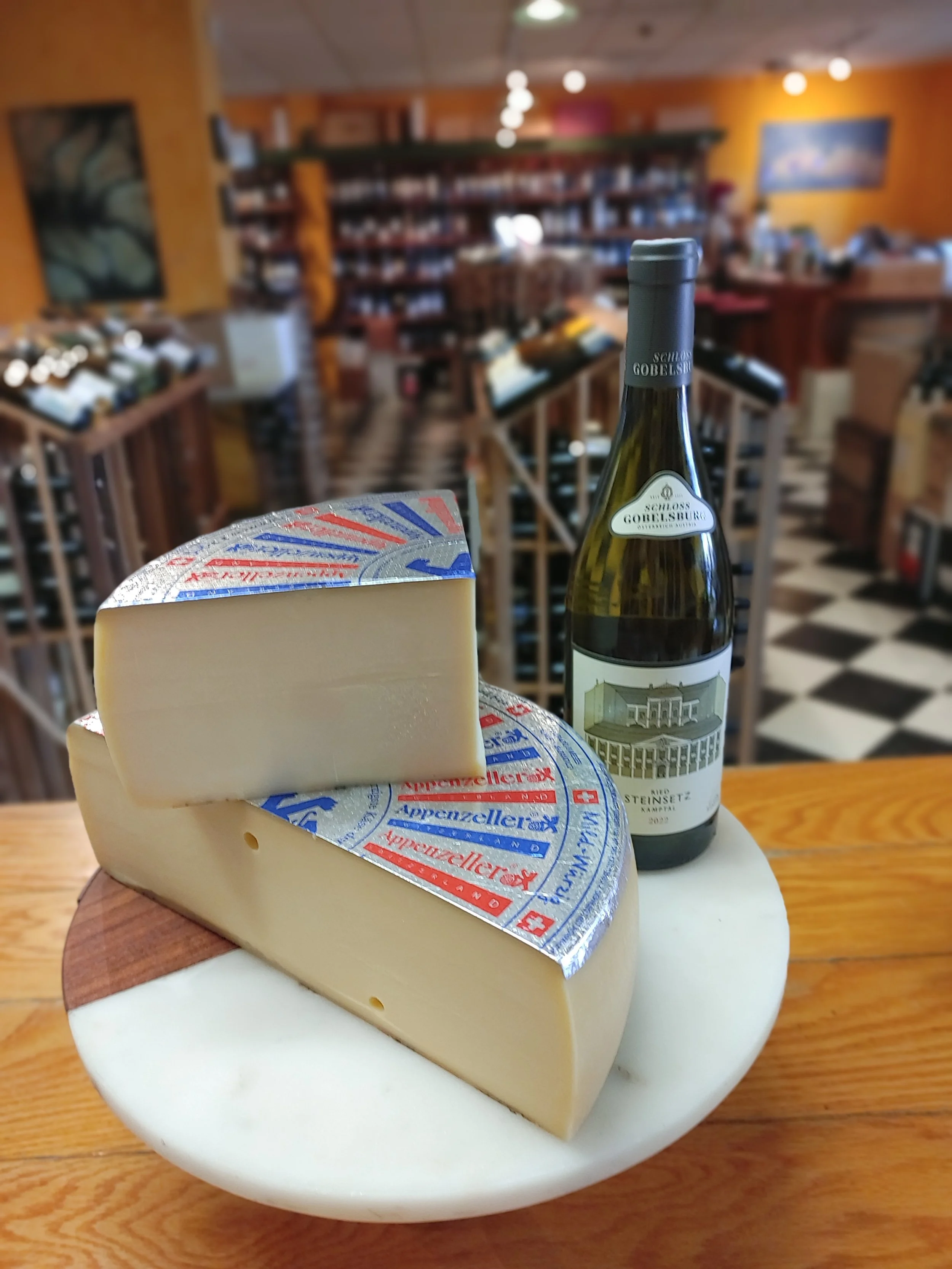 We suggest pairing the Appenzeller with Schloss Gobelsburg’s 2022 Ried Steinsetz Kamtal Grüner Veltliner. Fun to say and delightfully easy to drink, this quaffable Grüner Veltliner is fresh and has a mineral grip. Round and dense on the palate, this is a medium to full-bodied lush, and elegant wine. The intense white fruit and concentrated lemon notes will work well with the herbal tanginess of the Appenzeller. The bright, clear, and spicy bouquet of this Grüner Veltliner will enhance the spicy qualities of the cheese.